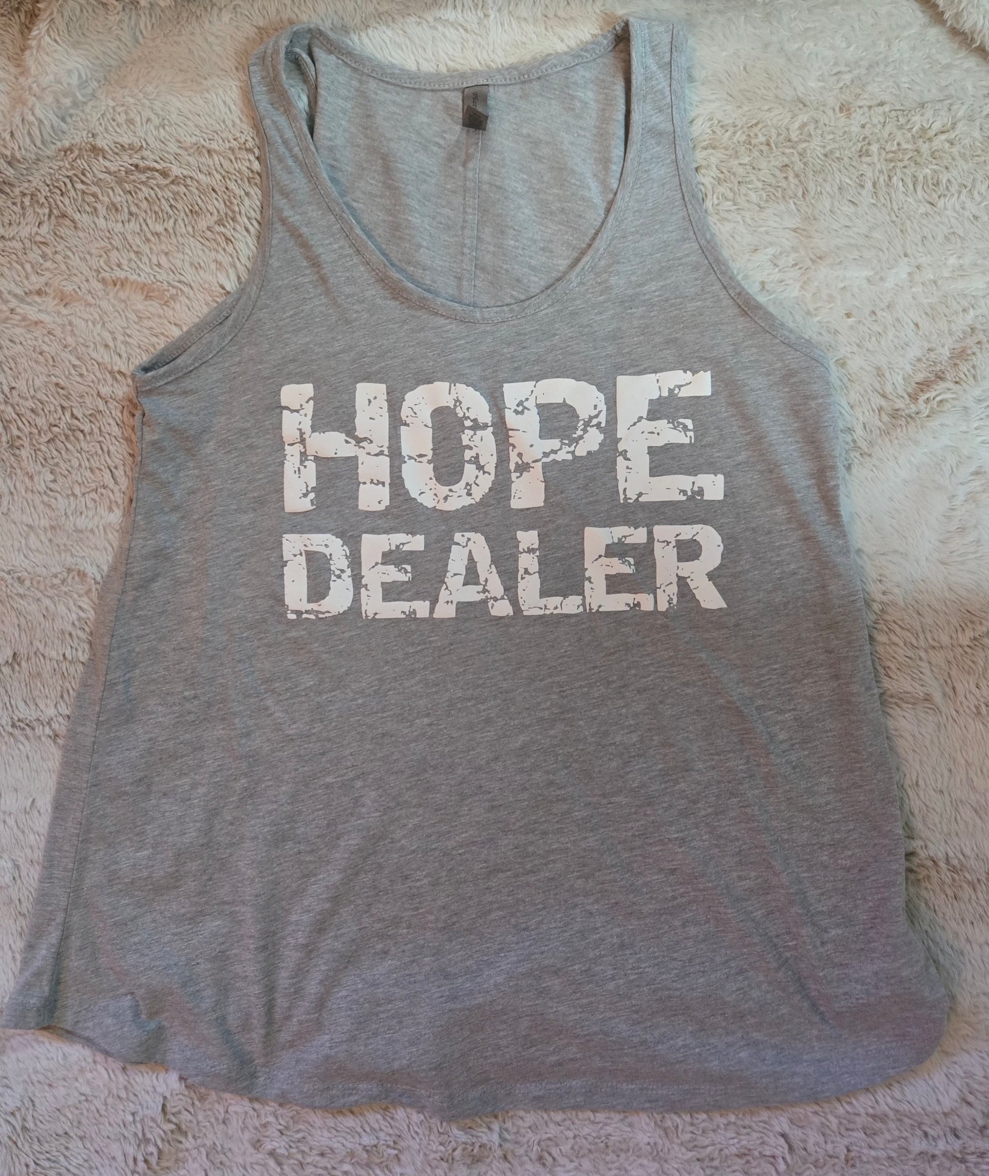 Hope Dealer distressed logo ladies flowy tank top. Light Heather Grey w/white logo.